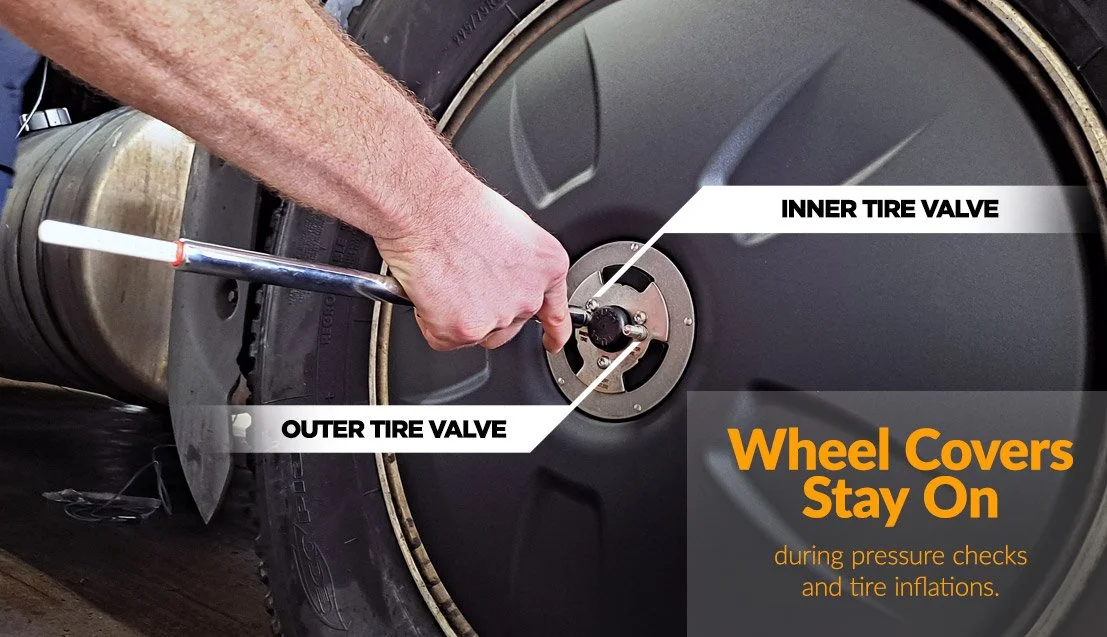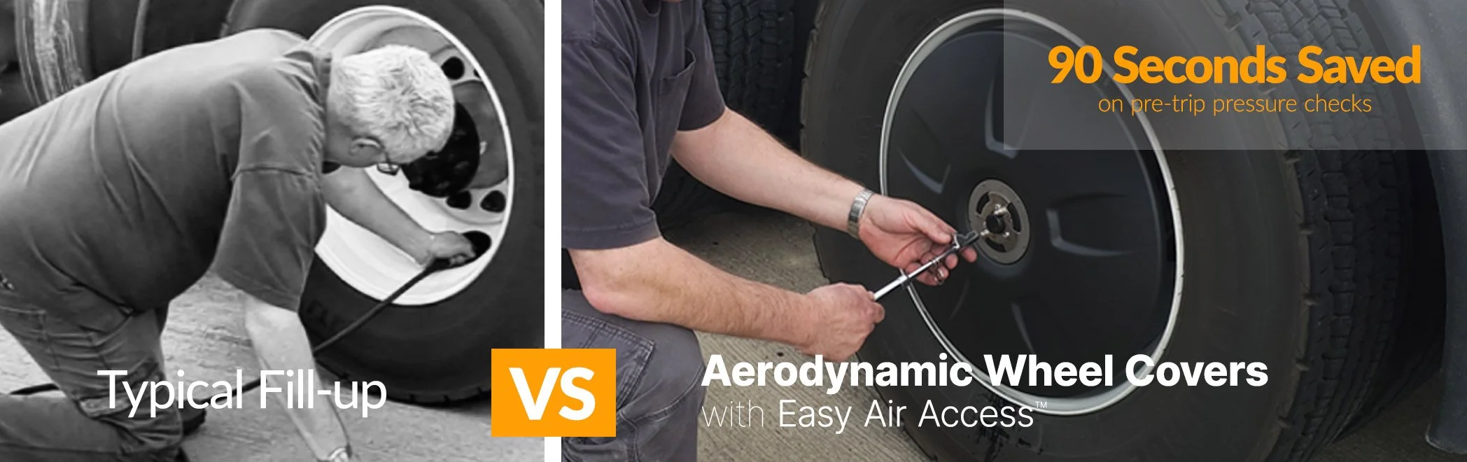 Wheel Covers with Easy Air Access make it easy to check air pressure and inflate tires without removing FlowBelow aerodynamic wheel covers. Market feedback drove the development of the solution, with the understanding that faster and easier pre-trips will lead to happier drivers and better tire maintenance. Properly inflated tires can positively impact key metrics that fleets routinely track: tire life, fuel economy, driver satisfaction, and safety.